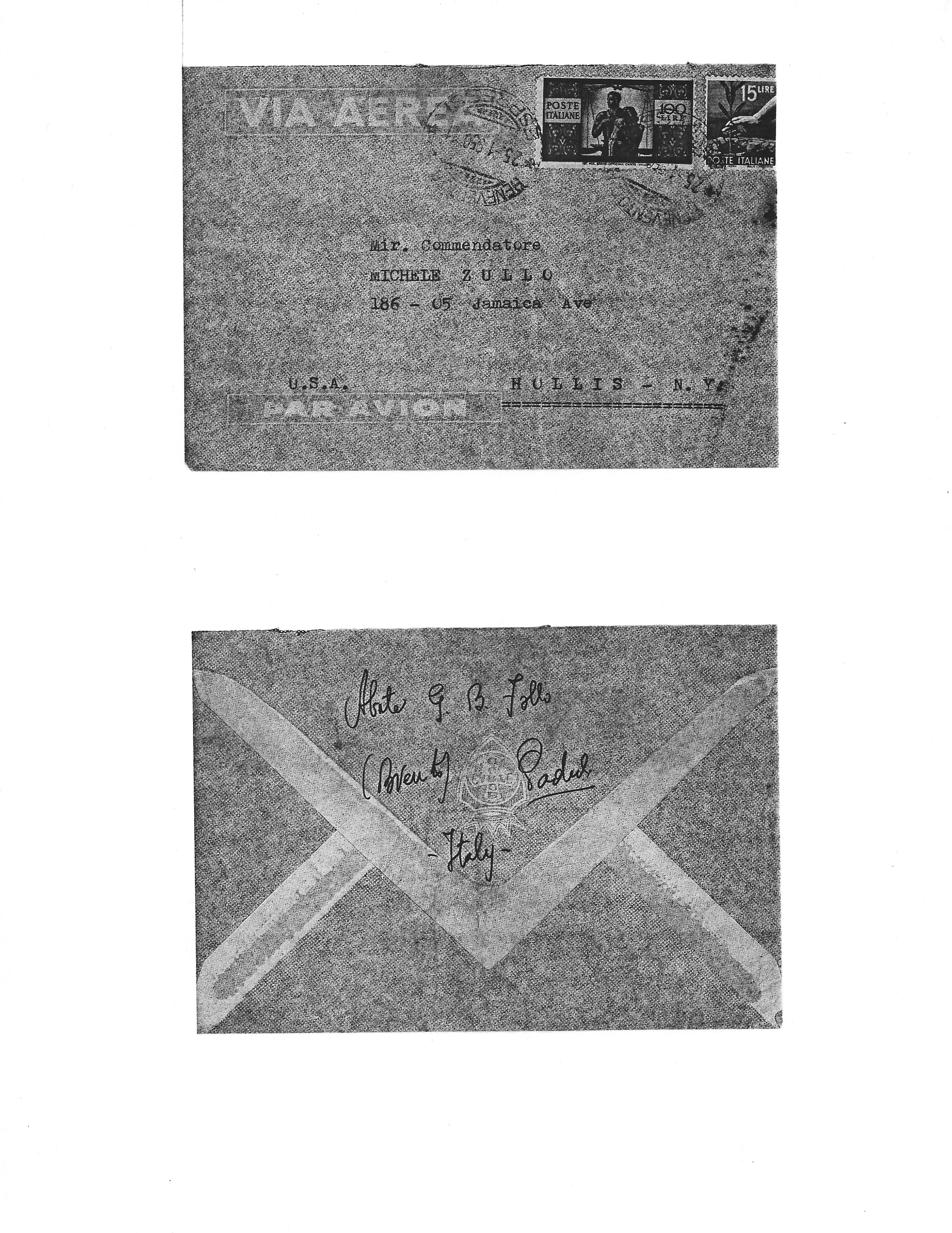 Addressee (front of envelope): Al Commendatore Mir. ZULLO MICHELE, 185 – 05 Jamaica Ave., HOLLIS – N.Y., U.S.A.
