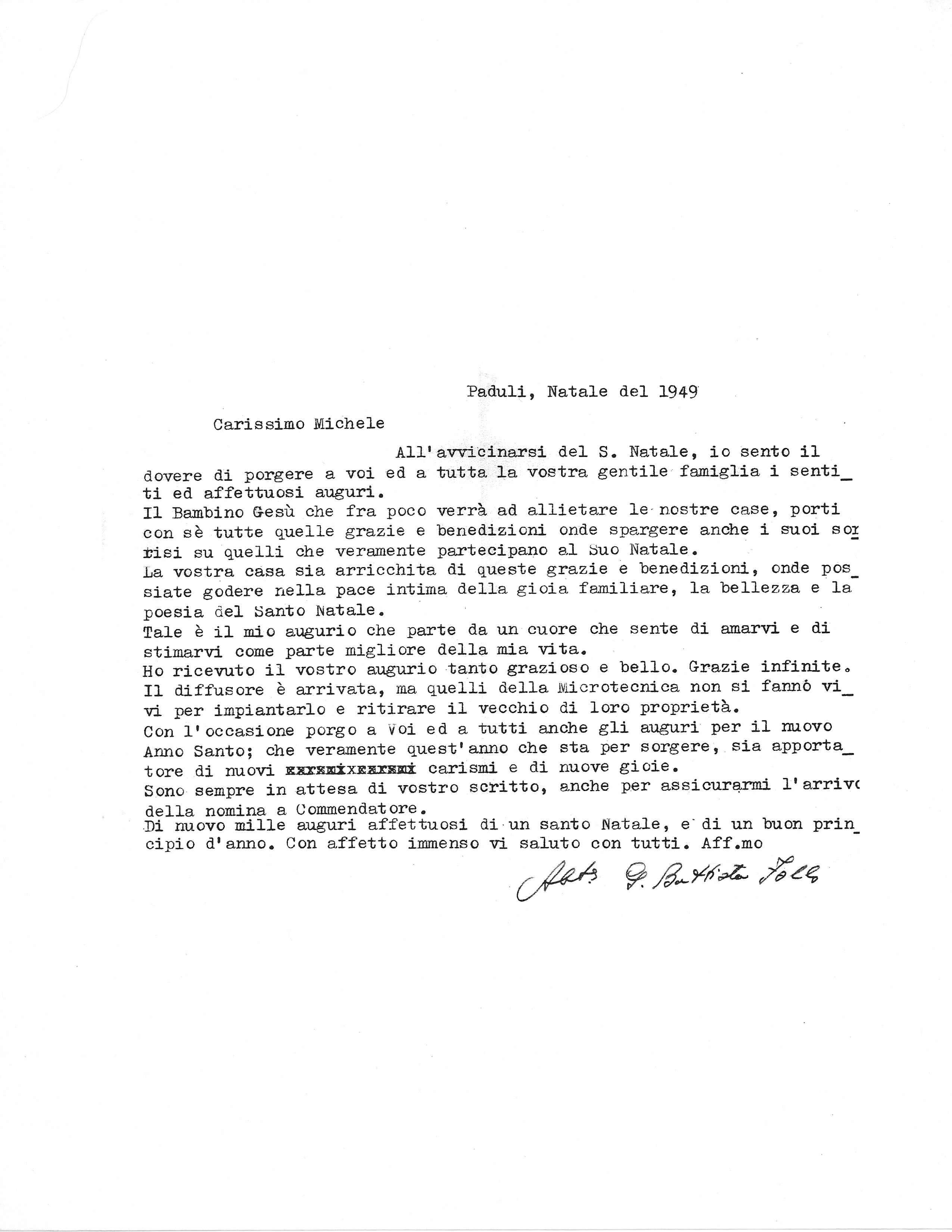 This is the fourth of ten letters between the Abbot Giovambattista Follo of Paduli and Michele Zullo. In addition to extending affectionate greetings for Christmas, the Abbot again mentions that the Diffuser for the Organ donated by the Padulese immigrants in America has not yet been delivered by Microtechnica. He also again asks for Michele to confirm whether he has received a letter conferring on him the honorary title of Commendatore.
