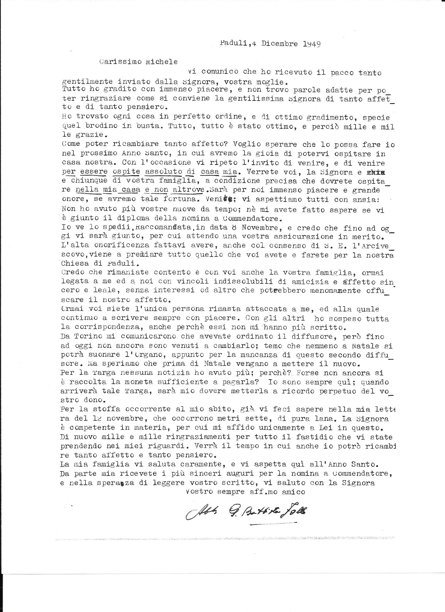 Letters: Abbot G.B. Follo to Michele Zullo, 4 December 1949