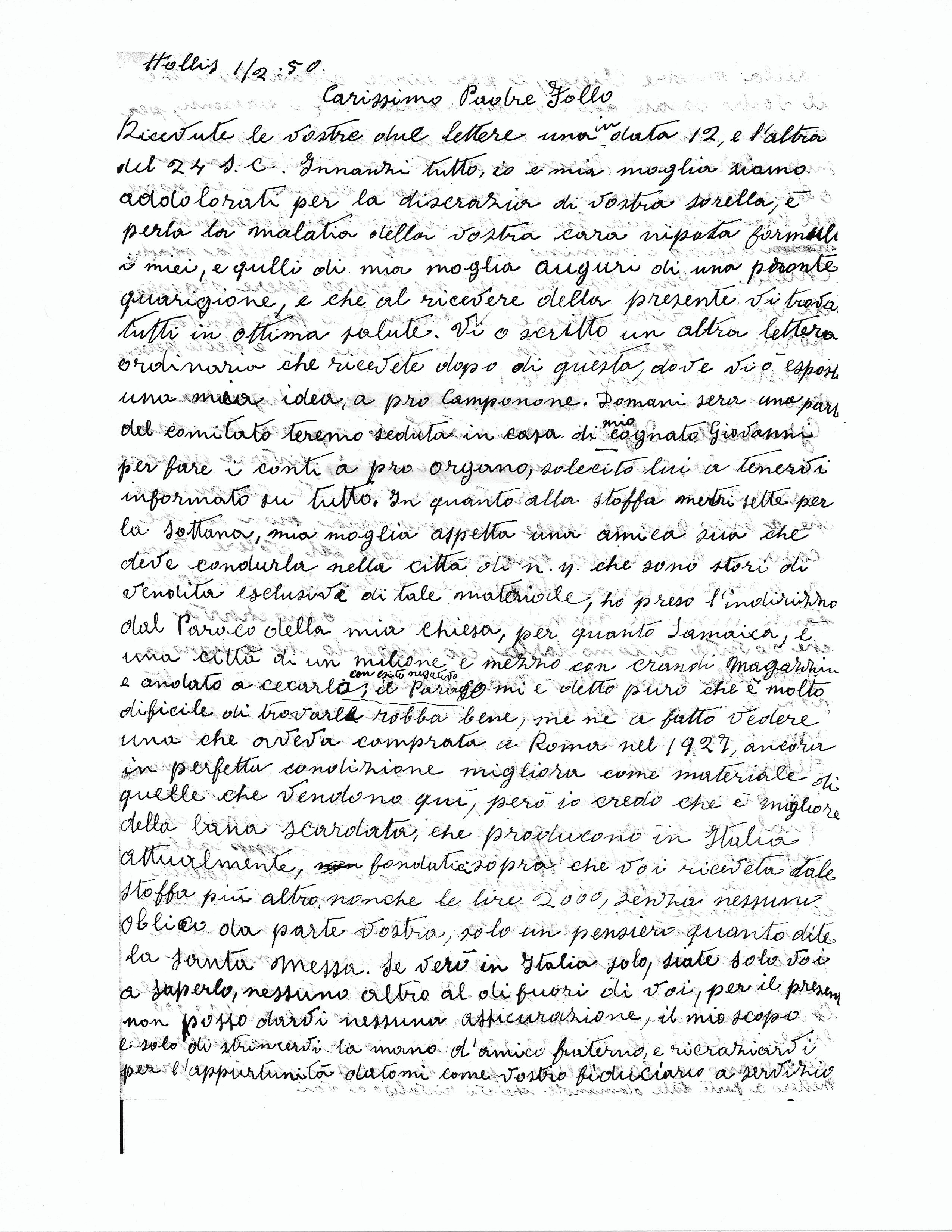 ENVELOPE: Postmarked 1-25-50 (25 January 1950), Paduli, Benevento. Two postage stamps: one 100 lire, and one 15 lire. Addressed to Mir. Commendatore MICHELE ZULLO, 186 – 05 Jamaica Ave, HOLLIS – N.Y., U.S.A. Back of envelope, in handwriting: Abate G. B. Follo (Benevento), Paduli, Italy. Translated by Alexander DeAngelis and revised Ma6 6, 2015]
